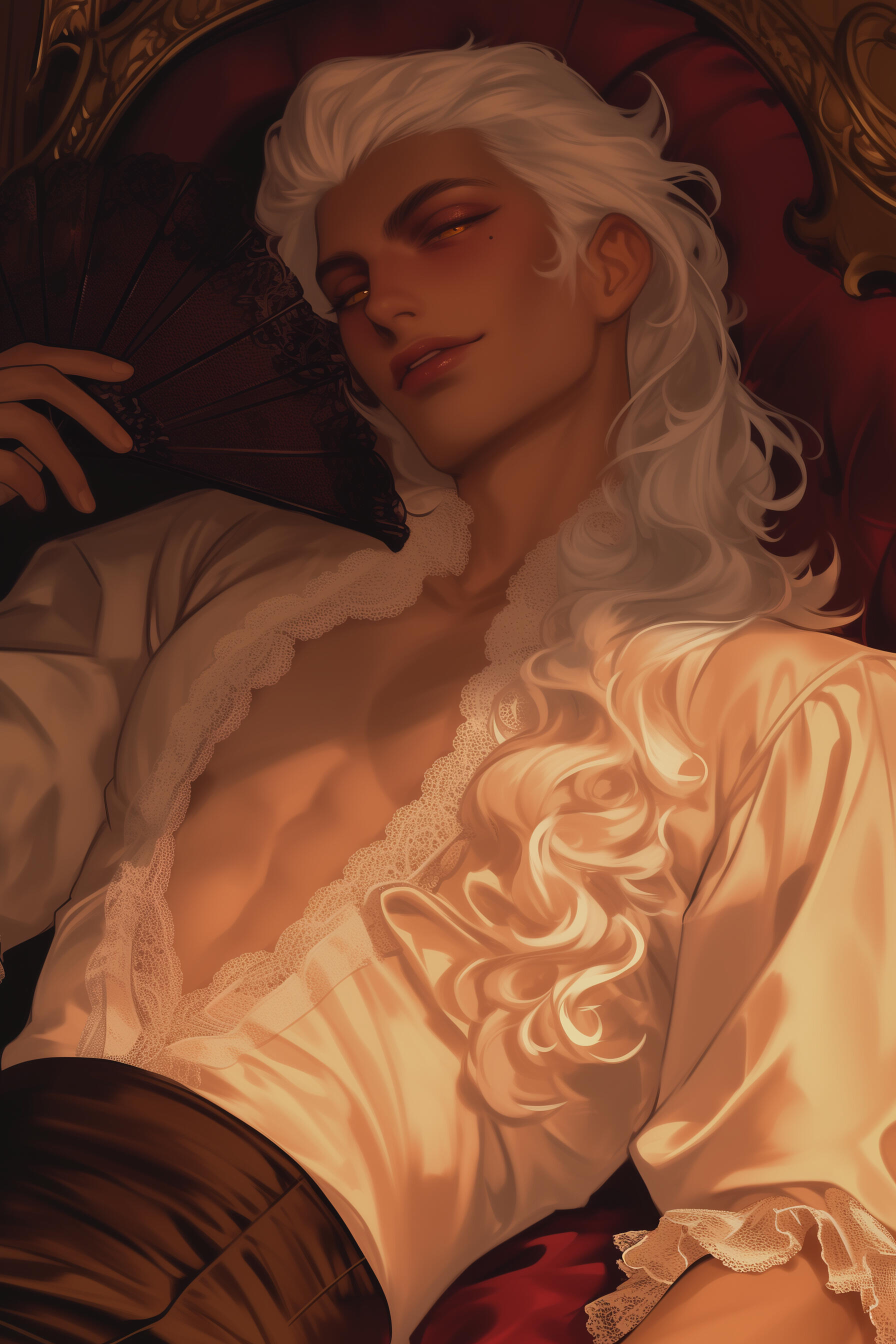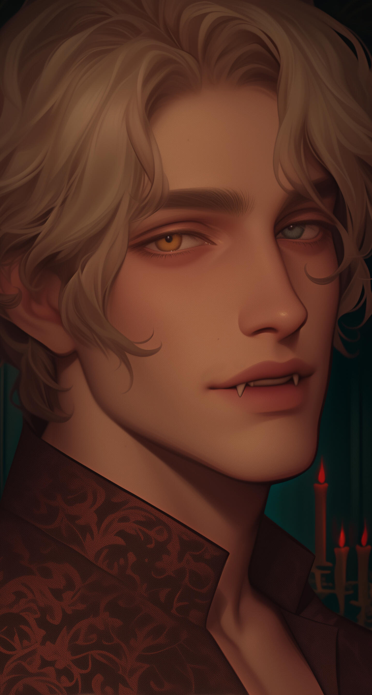 ❖ Léon des Ombres-Dorées is Étienne’s prettiest turned son and favorite errand boy—slim, sharp, and smiling, he’s the one sent to collect debts, deliver offers, and make problems melt with charm instead of open threats.❖ He flirts, flatters, and drapes himself over chair arms and balcony rails like a bored kitten, but his easy laughter hides a practiced instinct for weakness—he can smell desperation and shame on a debtor the way other vampires smell blood.❖ Inside the Palais, Léon’s bright act is half-survival, half-complicity; he understands exactly what his father is and what their money buys, but as long as he keeps the Bastard Prince amused and the ledgers flowing in the right direction, he gets to remain the golden child.