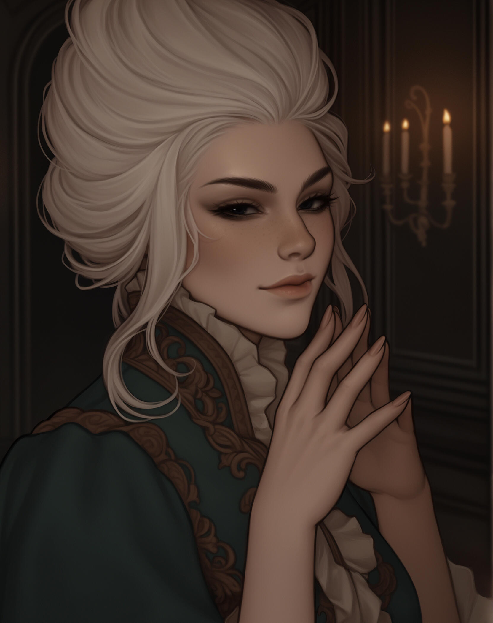 ❖ Marie is BelleSang’s Master of Whispers—a dazzling, extravagantly dressed manipulator who collects secrets, gossip, and thralls with the same meticulous vanity she applies to her own appearance.❖ She maintains an air-headed, vain façade at court, but beneath the powder and pearls is a ruthless strategist fiercely loyal to Florian and Renny; every rumor in Marseille seems to pass through her hands.❖ Marie’s twin thralls, Chaton Un and Chaton Deux, are living trophies—always masked and dressed to match—while Marie herself is adored by her followers and feared by rivals for the web of influence she spins.